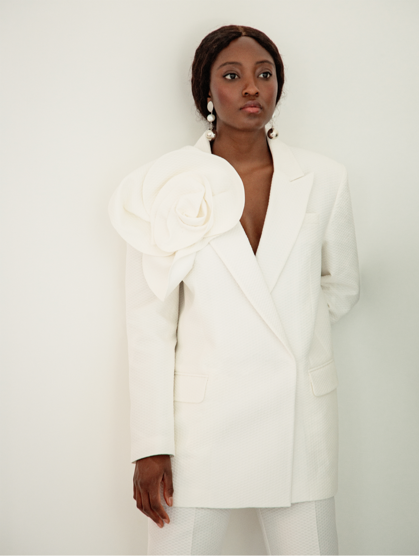 Oversized double-breasted blazer featuring a large floral decoration. Hidden snap closure at the front. Fully lined. The model is wearing a size 36.