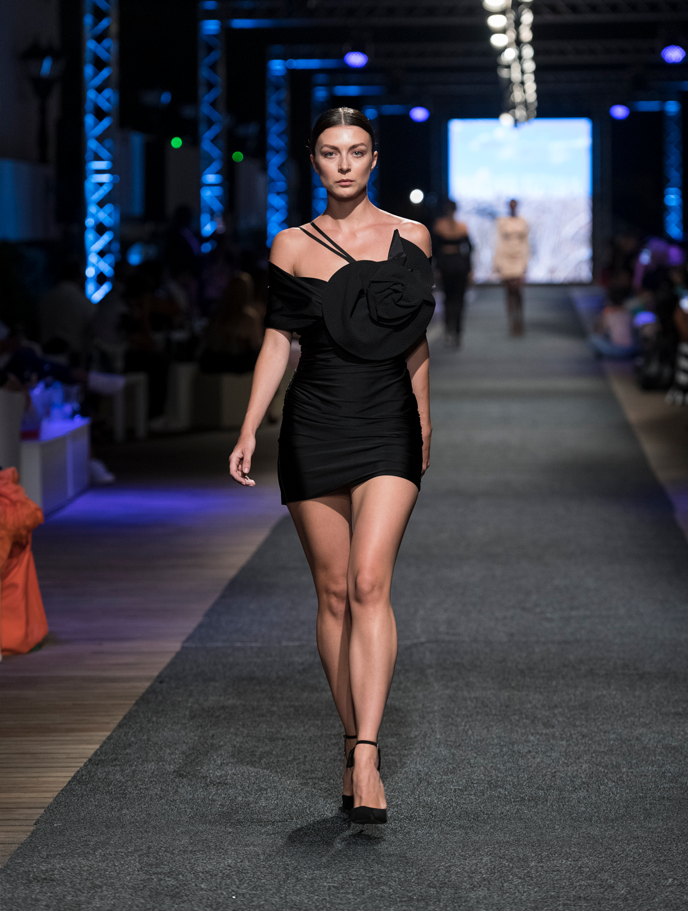 Fitted off-shoulder mini dress crafted from stretch jersey. Features asymmetric strap construction, side gathers, and a sculptural 3D flower detail at the front. The silhouette is defined by soft draping. The model wears size 36.