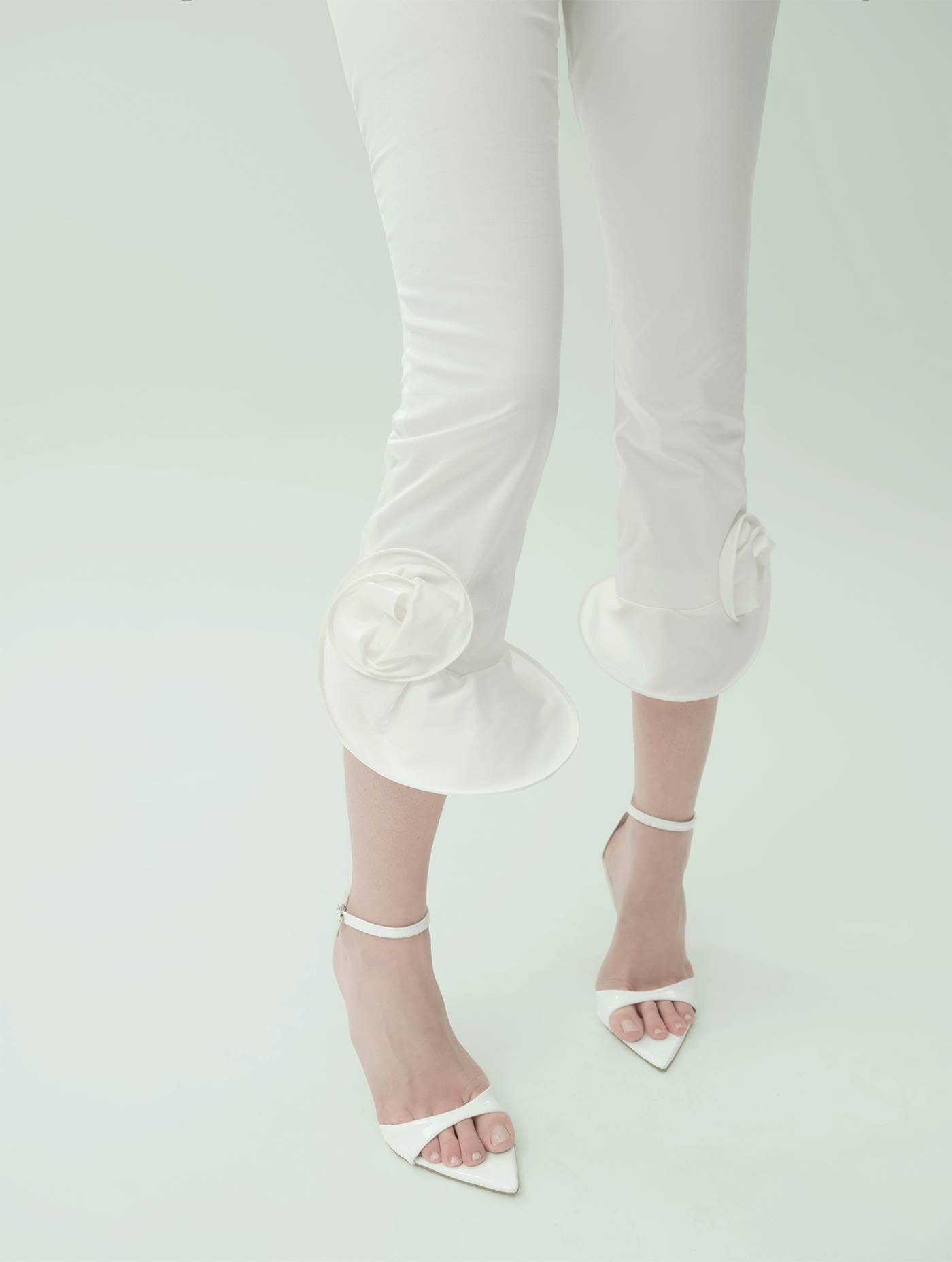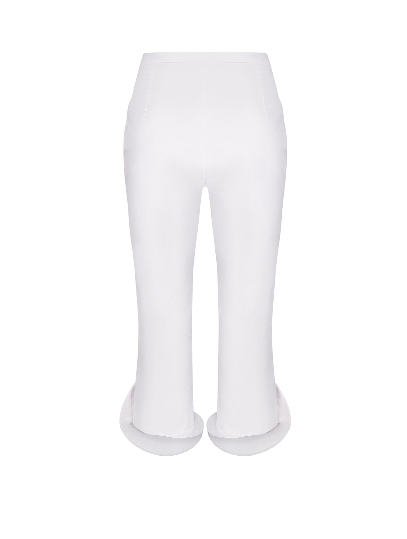 White cropped capri pants crafted from a refined cotton-blend fabric. The streamlined silhouette is finished with sculptural floral accents at the hem of each leg, adding dimension and texture. Light and structured, the design highlights clarity of form.