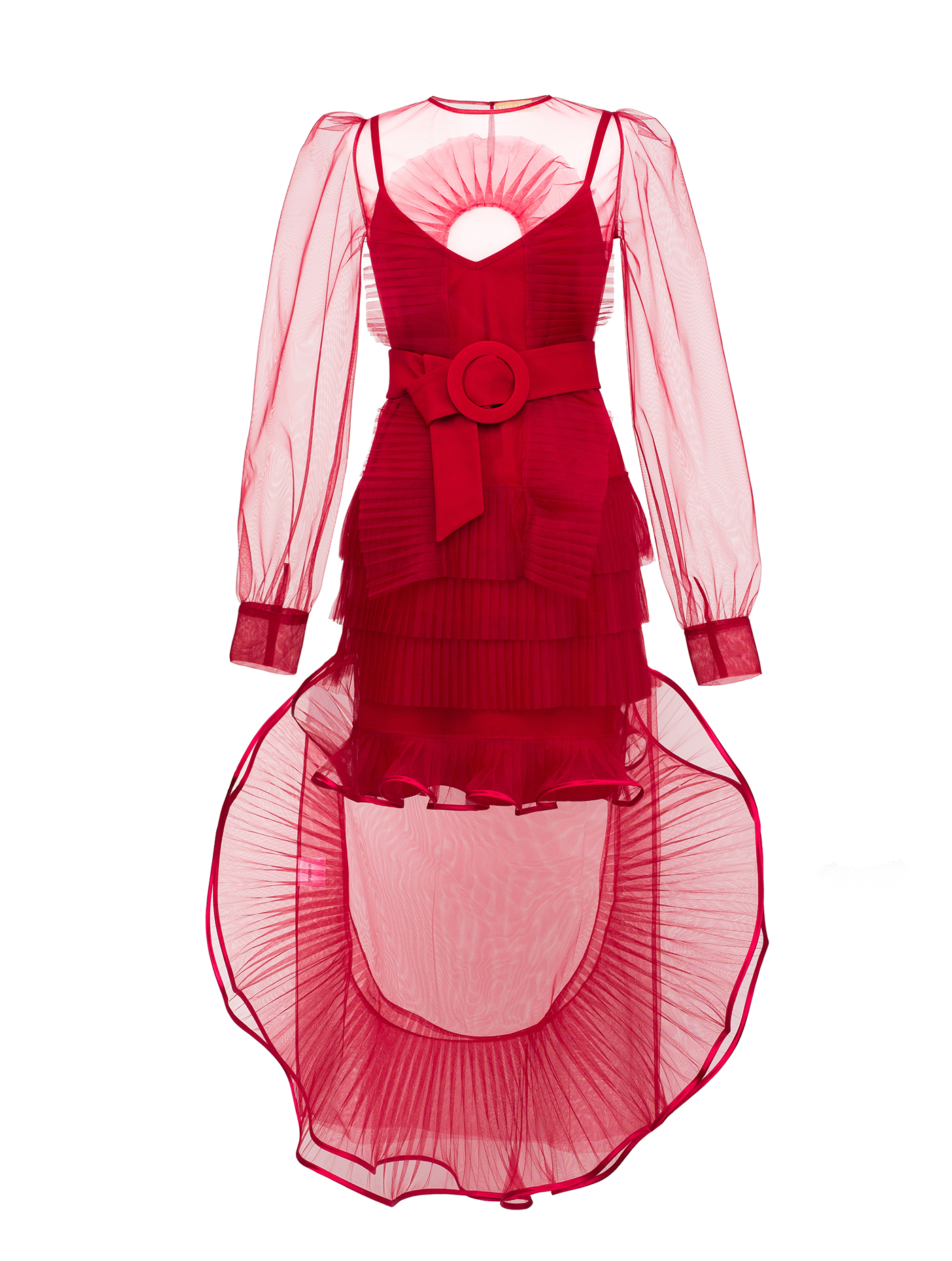ICONIC DESIRE RUFFLE LONG TULLE DRESS IN RED