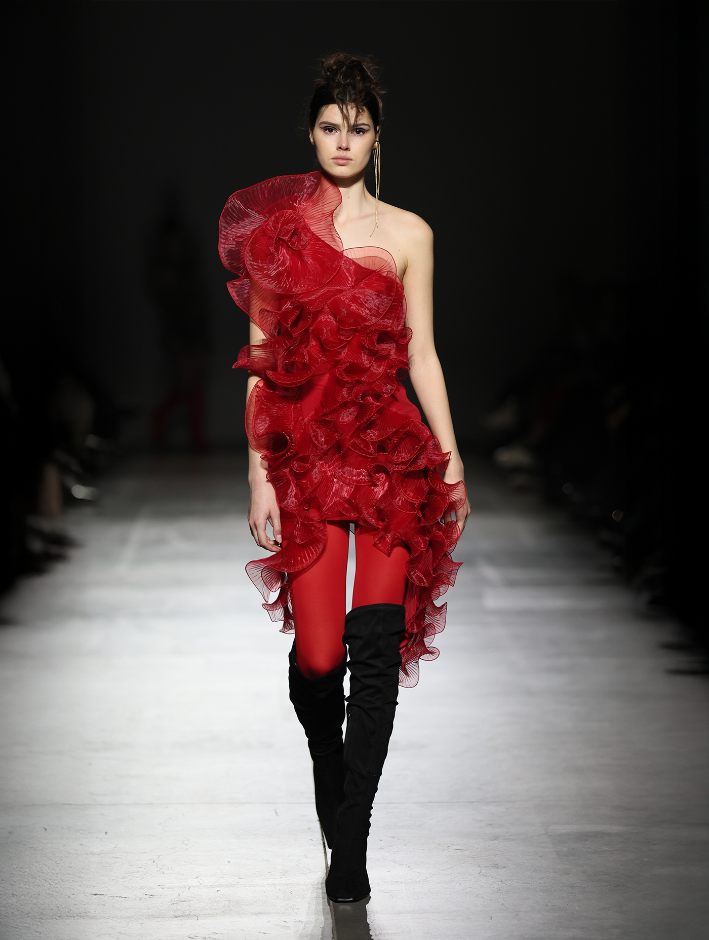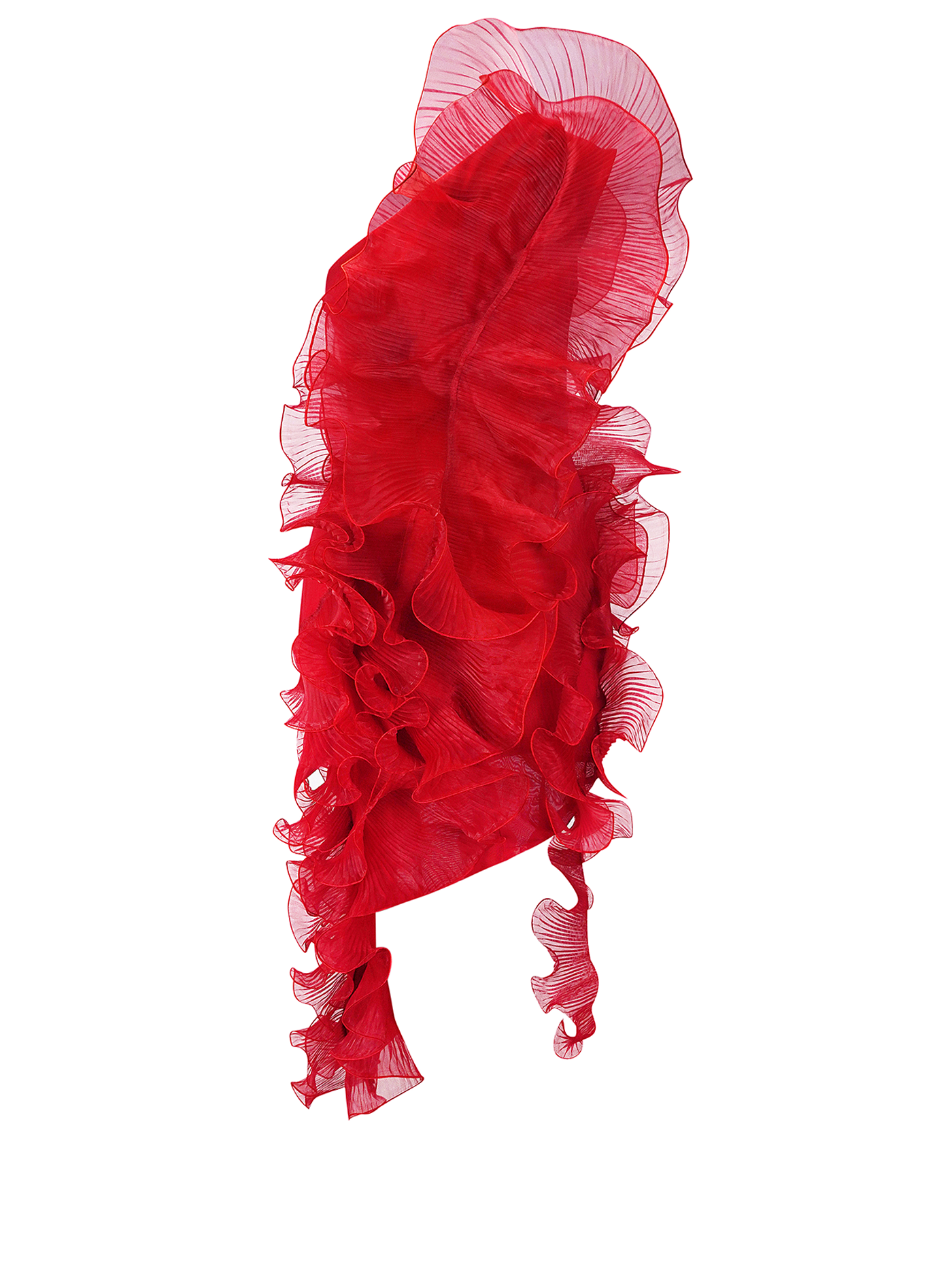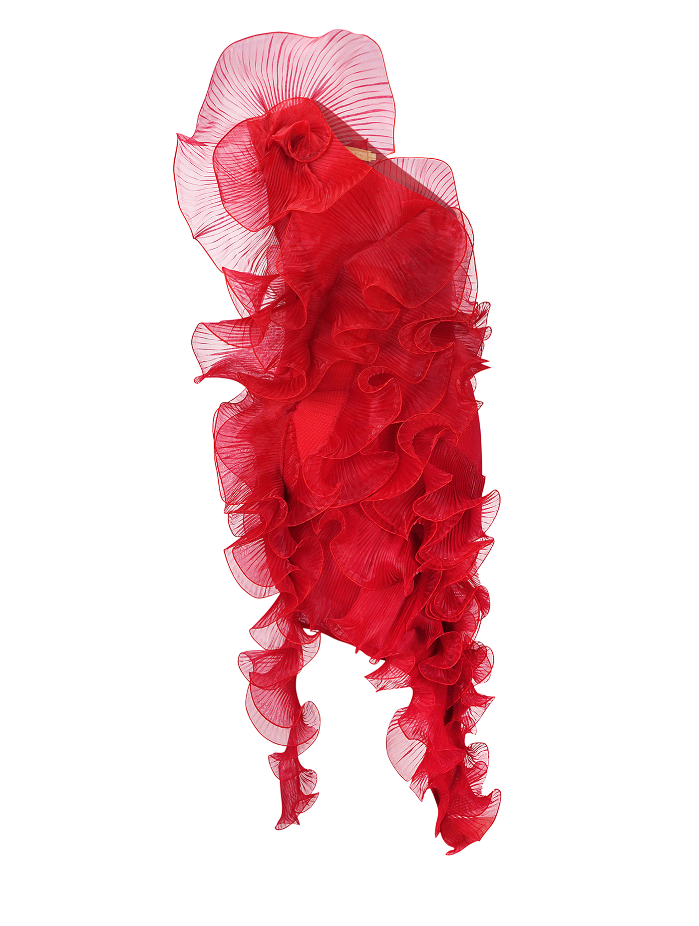 Asymmetrical mini dress crafted from delicate semi-transparent red organza on a nylon base. The architectural silhouette is emphasized by asymmetrically placed pleated floral appliqués along the hemline.