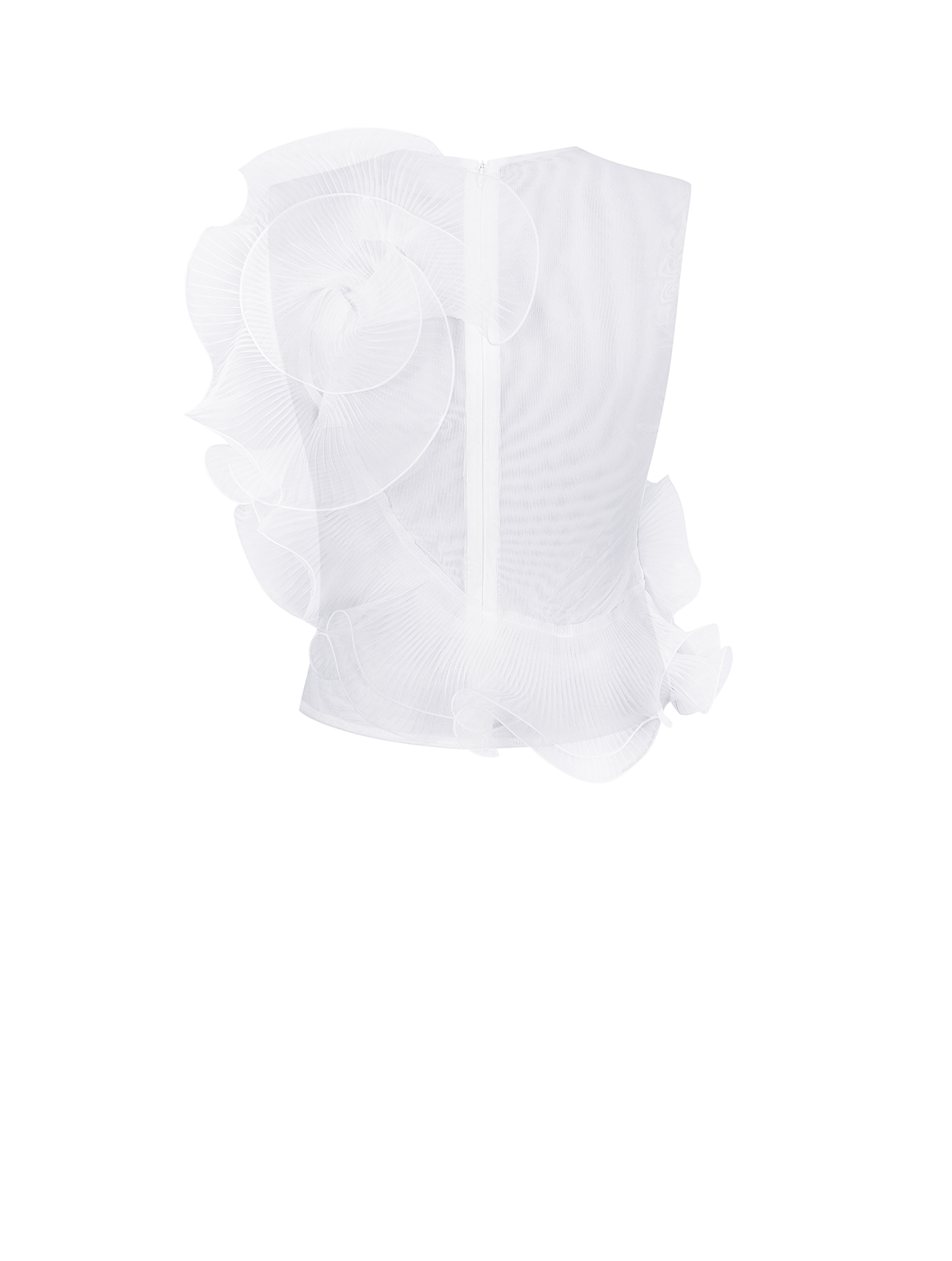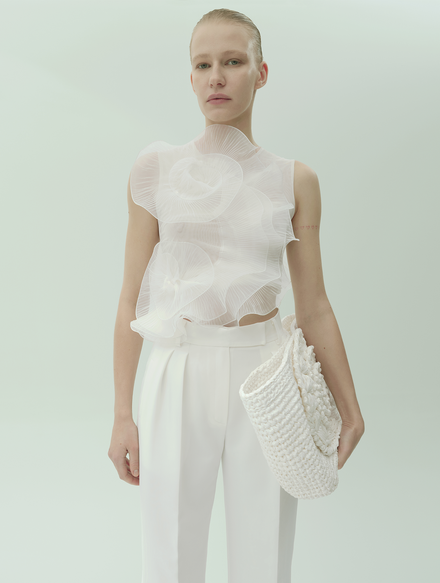 Cropped top crafted from delicate white organza on a nylon base with elastane. Embellished with sheer floral appliqués and refined pleated detailing, balancing transparency with structure. Model wears size 36.