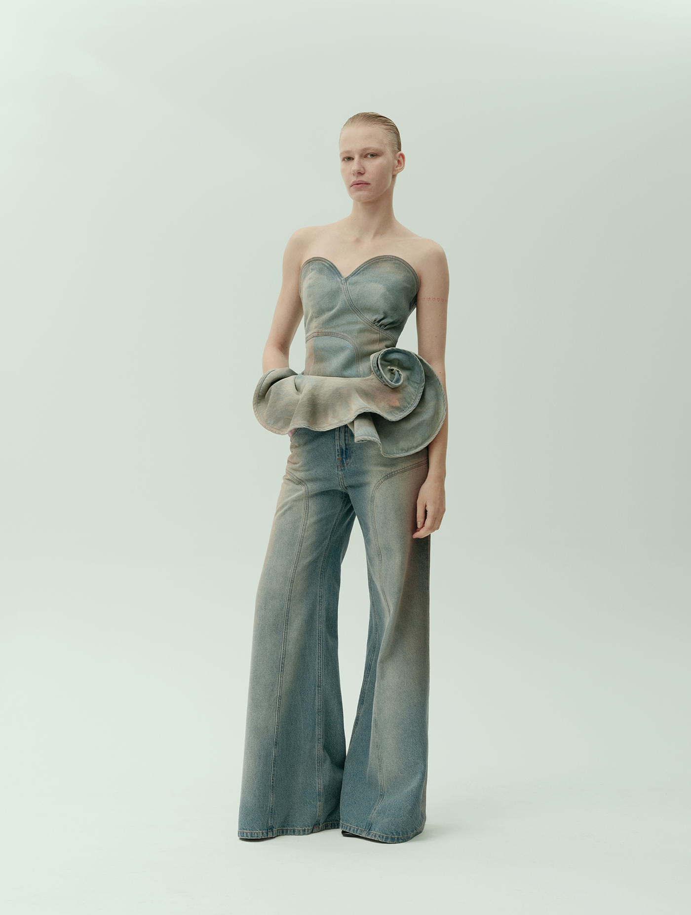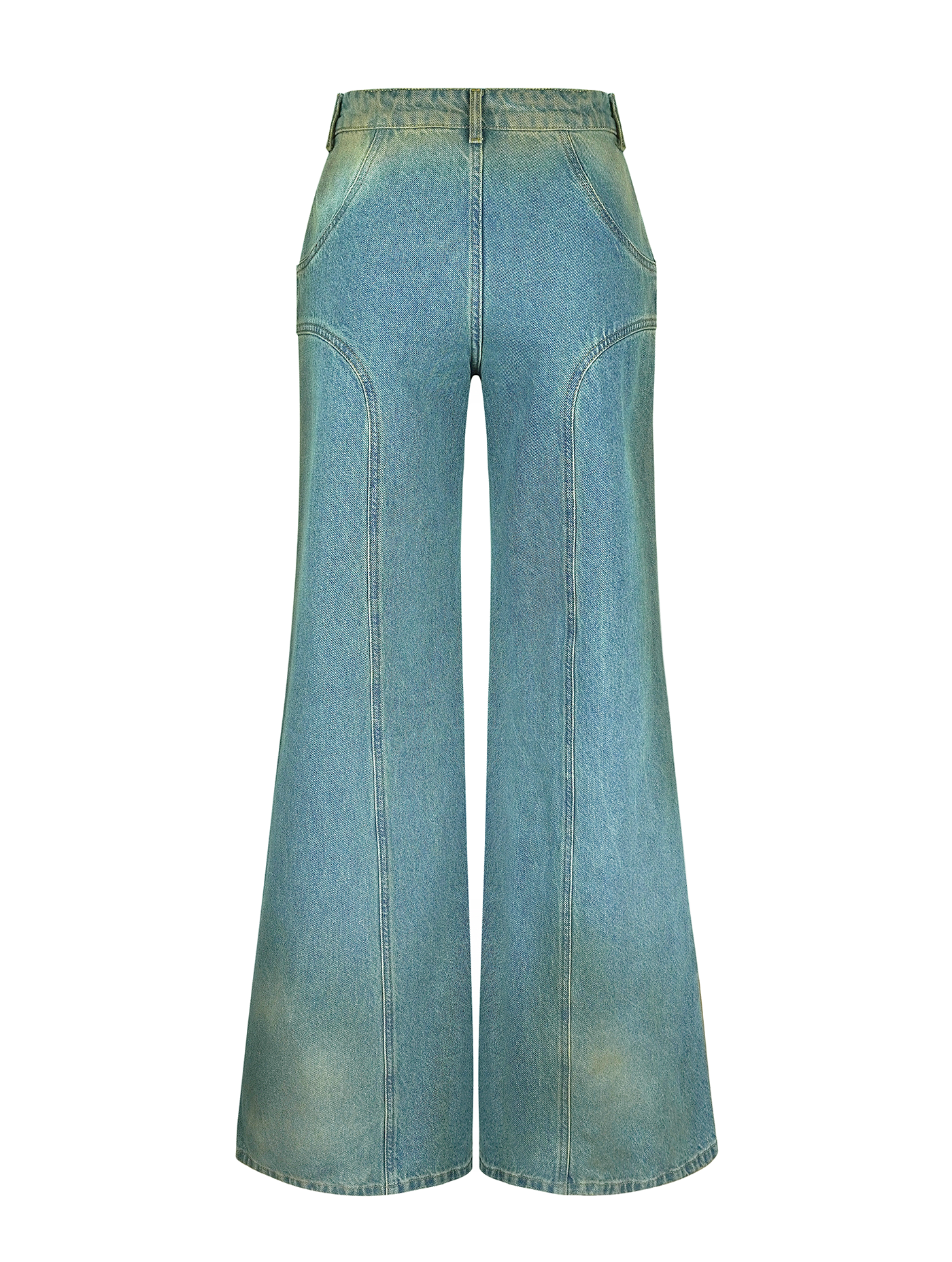 Джинси із завищеною талією у світло-блакитному відтінку з делікатним ефектом іржі. Силует із розкльошенням формує витягнуту лінію, а фірмові панельні шви, що проходять від стегон донизу, підкреслюють конструкцію виробу. Модель доповнена застібкою-блискавкою спереду. Поєднання вінтажного настрою та сучасної точності крою. Модель одягнена у розмір 36.