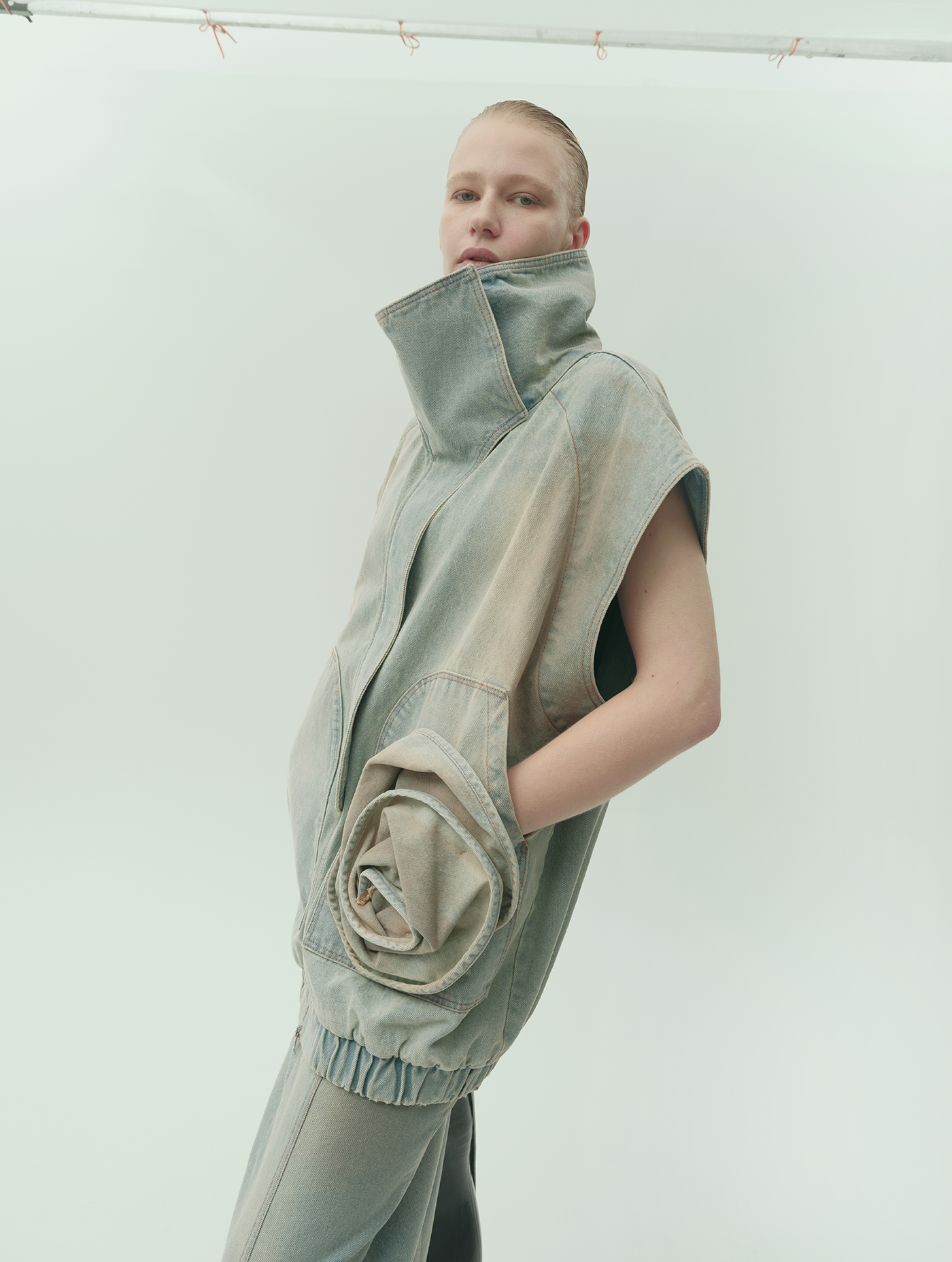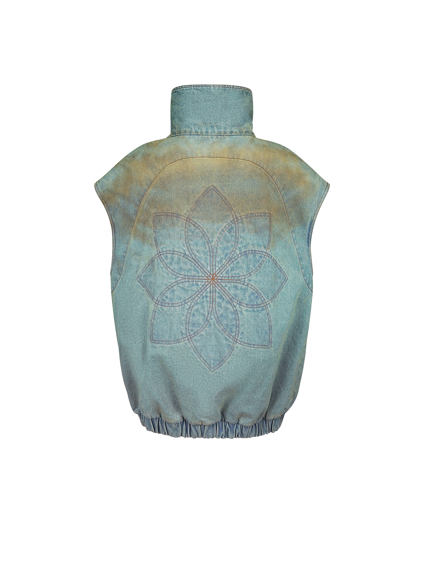 Oversized high-neck denim vest in a light blue tone with subtle rusty undertones. Designed with short raglan sleeves, a front zip closure, and an elasticated hem for a structured yet relaxed fit. A sculptural floral element and signature embroidery at the back define the piece. Model wears size 36.